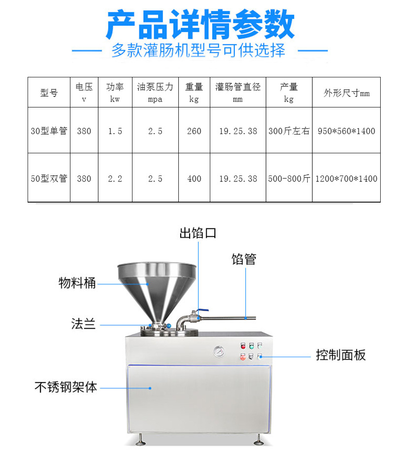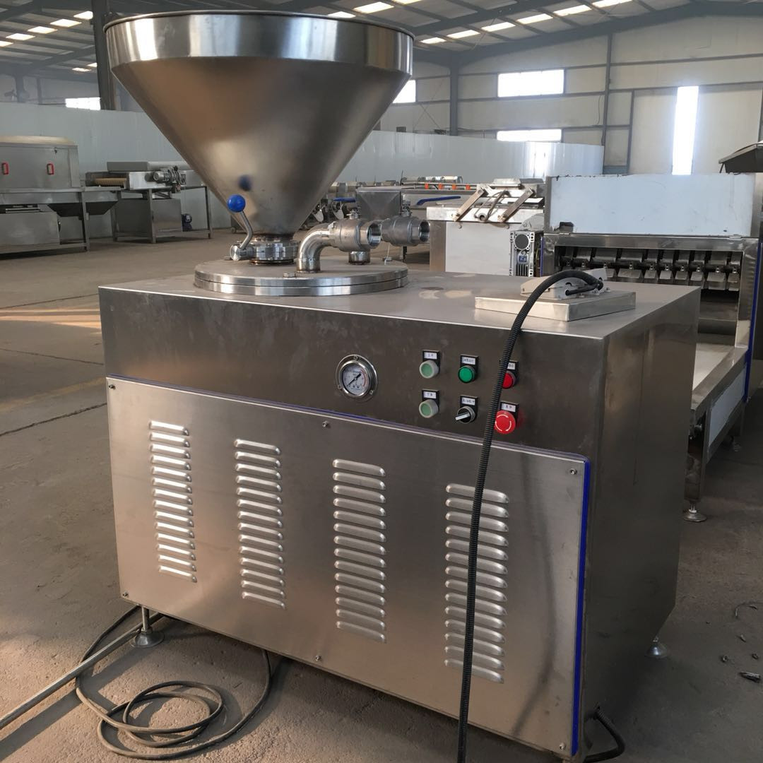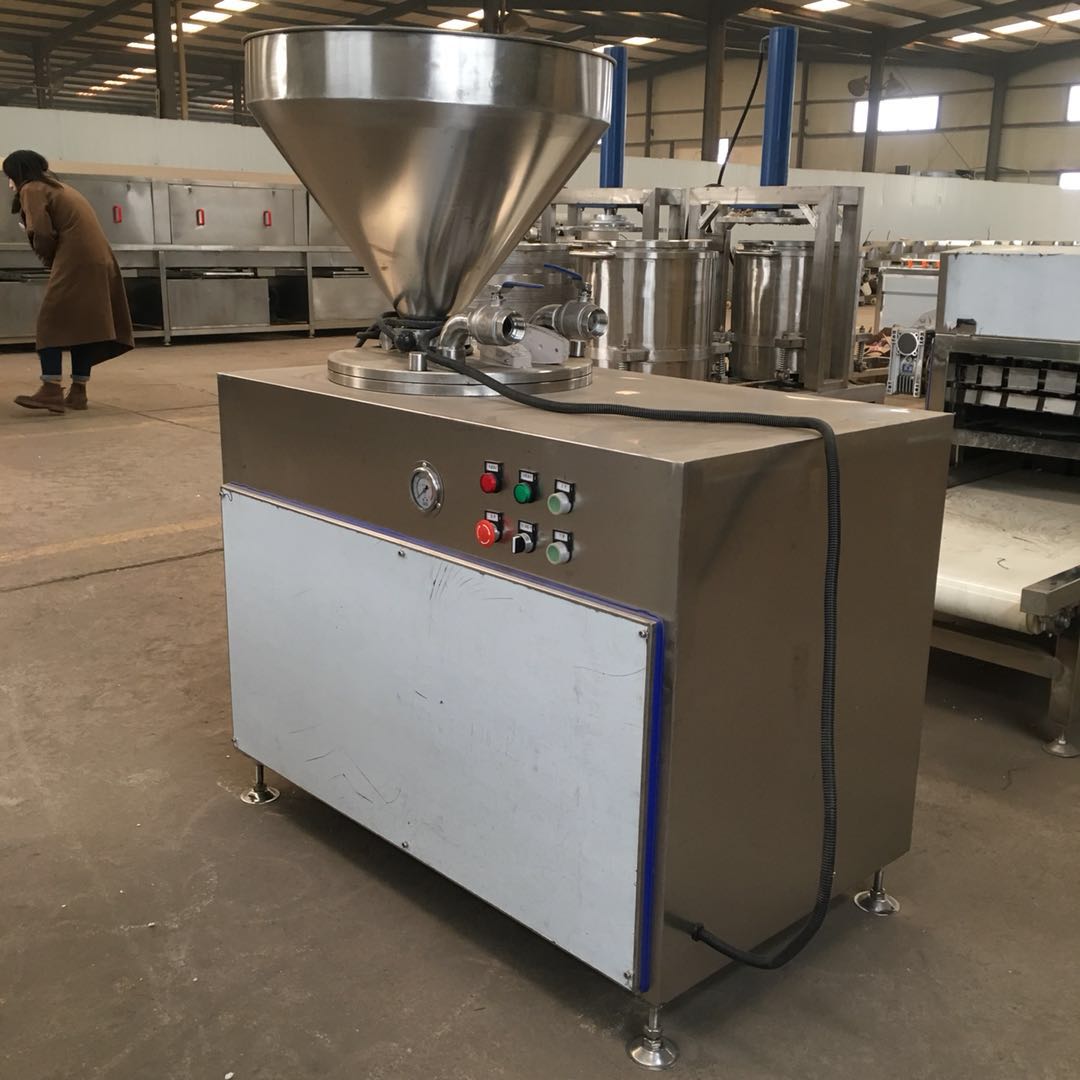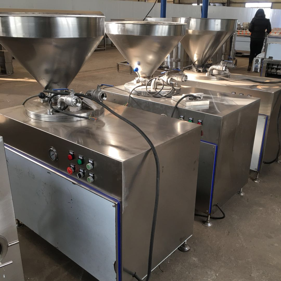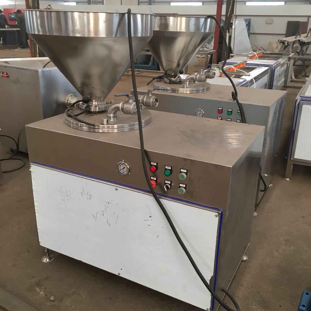 科力液壓灌腸機可以用于各種餡料灌制腸類,可加工雞肉腸,紅腸,臘腸,香腸,蔬菜腸,粉腸,大眾腸,烤腸,血腸,糯米腸等各種腸類。灌制速度快,效果好。該機上部設有貯料斗、碟形閥,可實現不掀蓋連續灌制,提高了工作效率。自動化程度高,該設備采用不銹鋼材質,堅固耐用易清洗。操作簡單方便,出料速度快,科力液壓灌腸機灌制的香腸腸體均勻,即可灌肉塊狀的腸,也可灌糜狀的腸,靈活方便,加料自如,效率高,并有很好的連續生產能力,清洗方便,適合各種類型的生產企業。